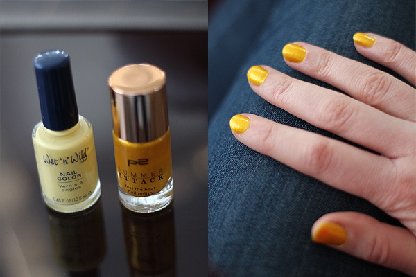 Momentan trage ich "020 Lemon Drop" allerdings noch mit einem Pastelgelben Unterlack von Wet 'n' Wild, den ich damals in den USA gekauft habe in der Farbe "423B Tweetie/Oisillon". Echt mal eine etwas andere Farbe und eine hammer Mischung zwischen Gelb, Gold und Senf. Bitte ignoriert meine furchtbar trockene Haut und diese gräsliche Wurstfinger-Perspektive, vorhin wollte mir einfach kein gutes Bild gelingen ;)